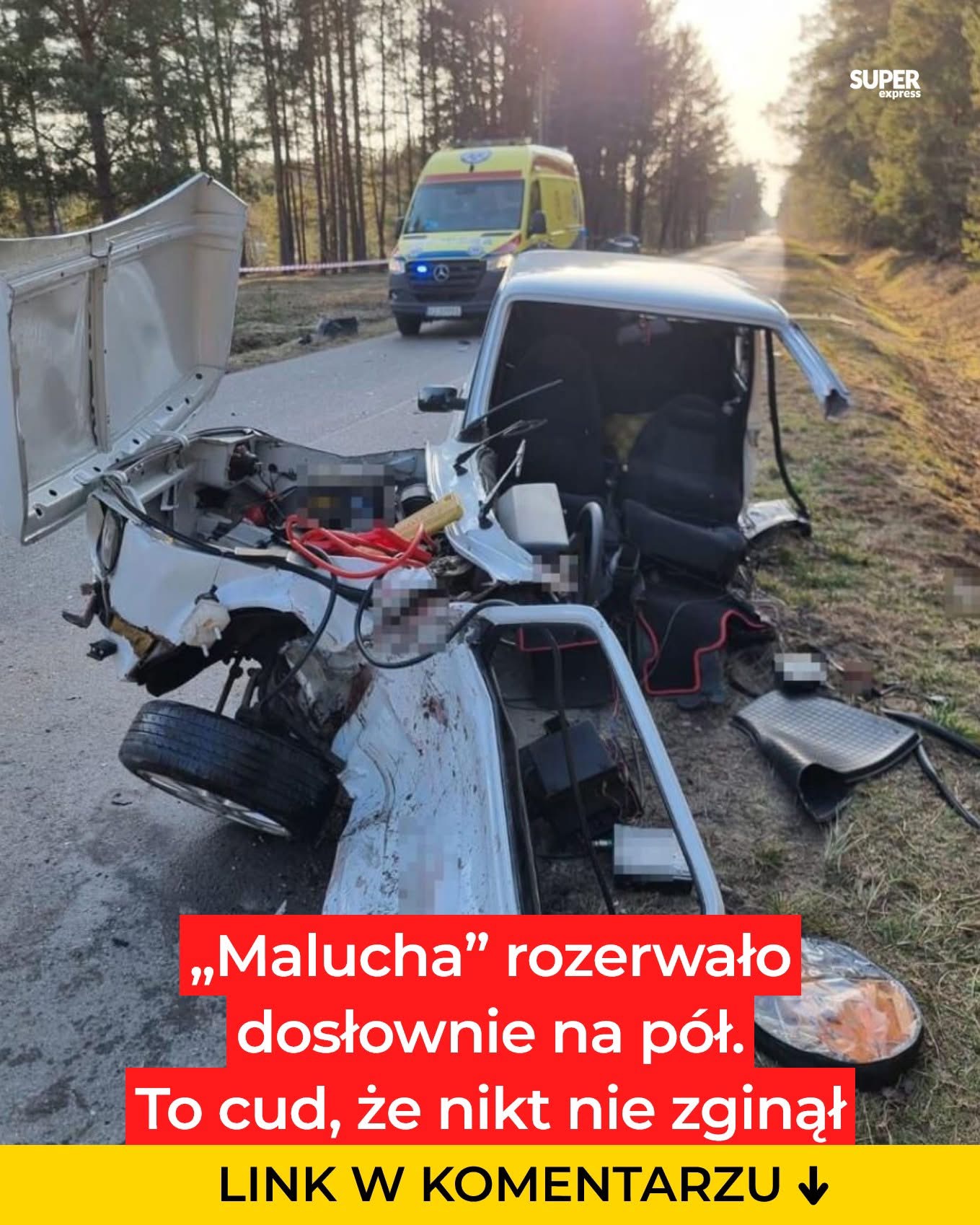 Siła uderzenia była tak duża, że fiat dosłownie rozpadł się na dwie części. Volkswagen zatrzymał się natomiast w przydrożnym rowie.
