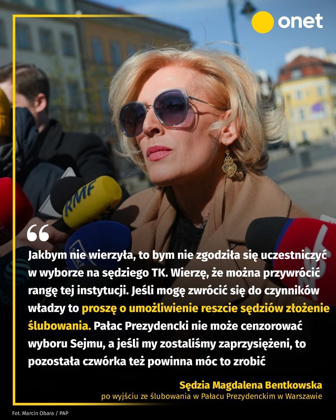 Jakbym nie wierzyła, to bym nie zgodziła się uczestniczyć w wyborze na sędziego TK. Wierzę, że można przywrócić rangę tej instytucji. Jeśli mogę zwrócić się do czynników władzy, to proszę o umożliwienie reszcie sędziów złożenie ślubowania. Pałac Prezydencki nie może cenzorować wyboru Sejmu, a jeśli my zostaliśmy zaprzysiężeni, to pozostała czwórka też powinna móc to zrobić — powiedziała sędzia Bentkowska po ślubowaniu.