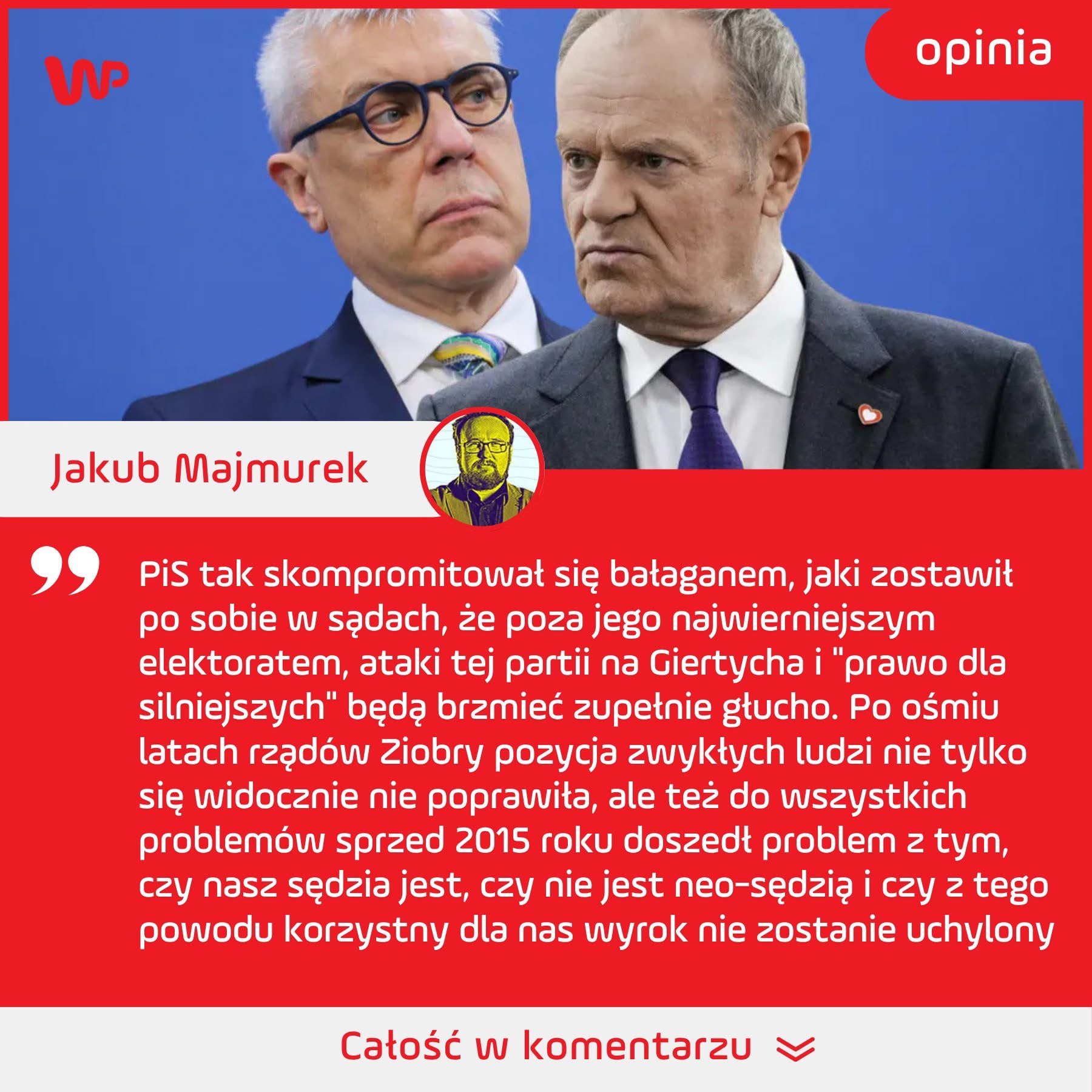 Problemem dla premiera może jednak okazać się to, że opinia publiczna niekoniecznie będzie potrafiła oddzielić grubą kreską aktywność Giertycha adwokata od aktywności Giertycha polityka. Zwłaszcza że w sprawie, którą opisali Jadczak i Wysota, wielu wyborców KO będzie instynktownie utożsamiać się z frankowiczami nieskutecznie próbującymi odzyskać pieniądze od reprezentowanej przez Giertycha instytucji.