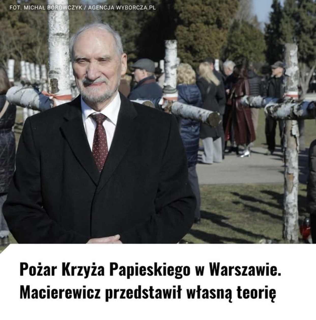 Poseł PiS Antoni Macierewicz przedstawił teorię dotyczącą piątkowego (3 kwietnia) pożaru Krzyża Papieskiego przed kościołem na warszawskim Mokotowie. “Analiza śladów pożarowych wskazuje na umyślne podpalenie” – wskazał we wpisie na X.