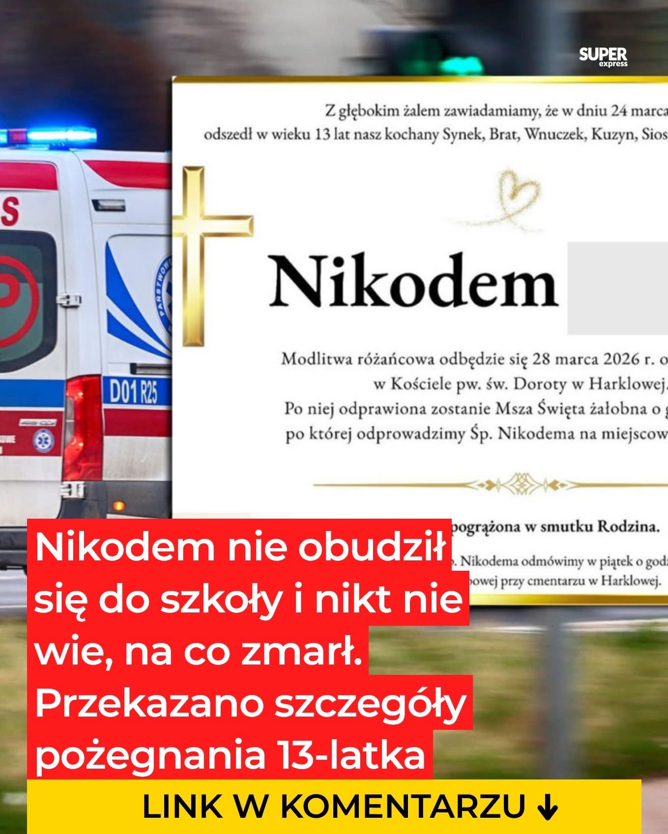 W Harklowej pod Jasłem doszło do niewyobrażalnego dramatu. To miał być zwykły dzień, ale 13-letni Nikodem nie obudził się do szkoły. Pomimo natychmiastowej pomocy służb, chłopca nie udało się uratować. Sekcja zwłok nie odpowiedziała jednoznacznie na pytanie, co było przyczyną jego śmierci. Przekazano informację o ostatnim pożegnaniu Nikodema.