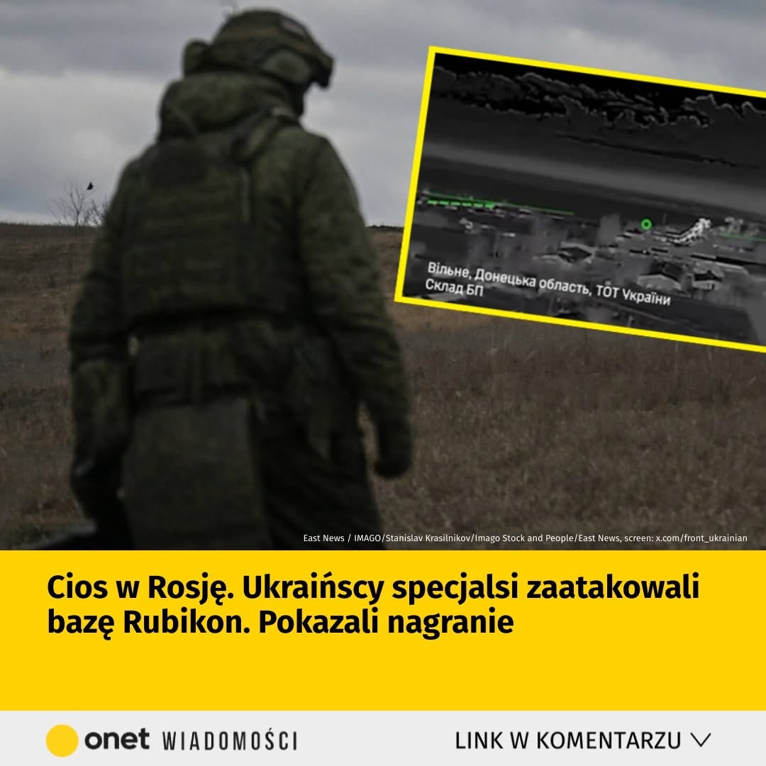 Ukraińskie siły specjalne przeprowadziły nocny atak dronami na bazę rosyjskiej jednostki Rubikon w obwodzie donieckim. W mediach społecznościowych opublikowano nagranie, na którym widać moment uderzenia.